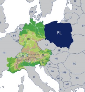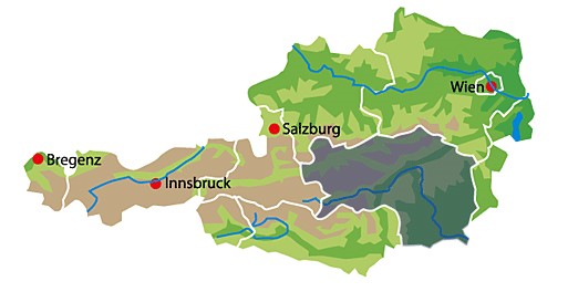 Die in der Karte farbig (grün-braun) angelegten Alpenländer, sowie Deutschland, verfügen im Weiteren über eine verfeinerte Suche nach Regionen.