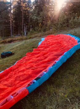 Er lag die letzten Monate locker offen zusammengelegt und lichtgeschützt nur herum und wird nicht mehr benötigt. Es ist ein sehr guter Anfängerschirm mit toller Flugleistung und gutem Handling.