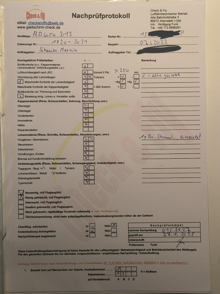 Hat ca 1h Soaring, max. 2 h groundhandling und 15 Abgleiter.