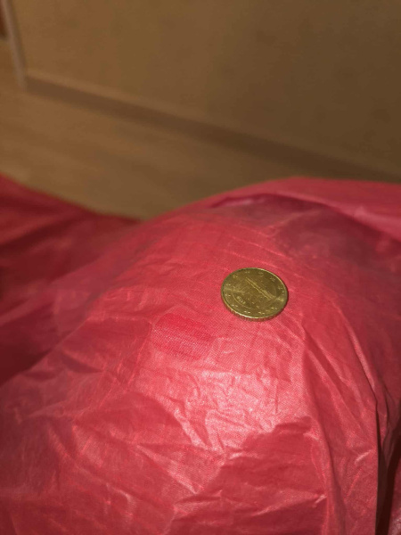 Letzter Check: Eine Steuerleine erneuert, Ummantelung war aufgerieben, 2 Patches, beide kleiner 1 cm, Tuch im Reisverschluss vom Packsack eingeklemmt, Patches in Tuchfarbe.