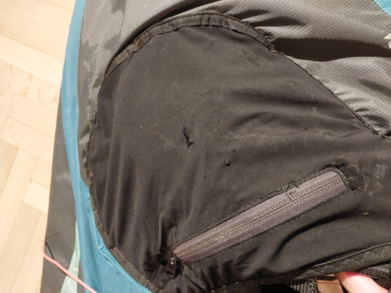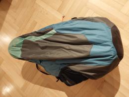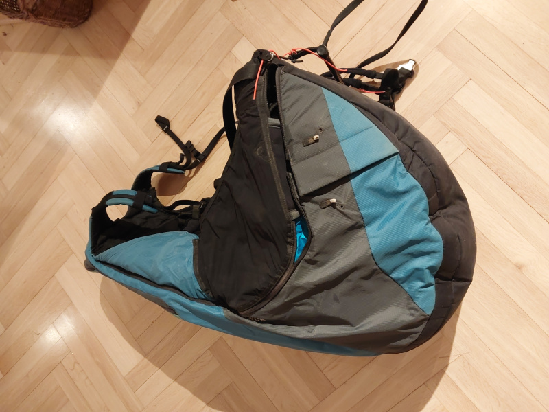 Andvance Axess 4 Farbe antracite/spectra green. Optisch stark gebraucht/dtl. ausgeblichen. Technisch in Ordnung, voll gebrauchsfähig. Lediglich kleine Risse in der Seitentasche (s. Bild) und 1 cm Riß an der Sitzbrettkante links. Mit original Rettungsgerätecontainer, ohne Rettung.