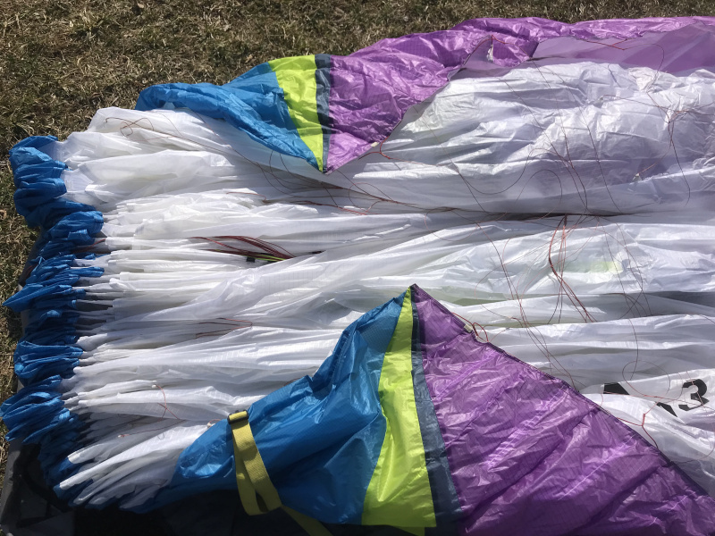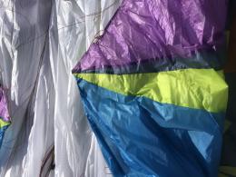 Farben alle noch kräftig im Obersegel ( siehe Bilder ), keine Flicken oder Unfälle, wurde immer Zelle auf Zelle gestreckt im Hangar gelagert !