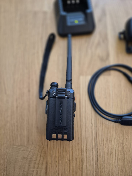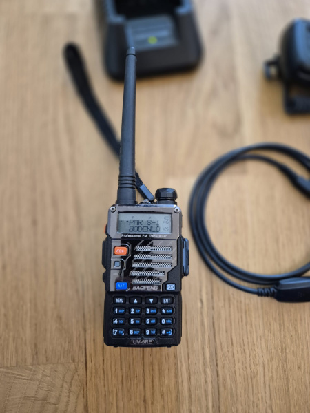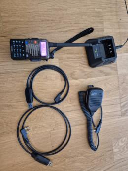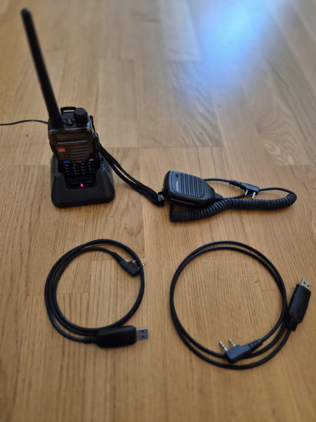 Baofeng Funkgerät, mit (zwei) Programmierkabeln, Ladestation, Netzteil und Lautsprecher-Mikrofon (PTT).