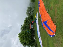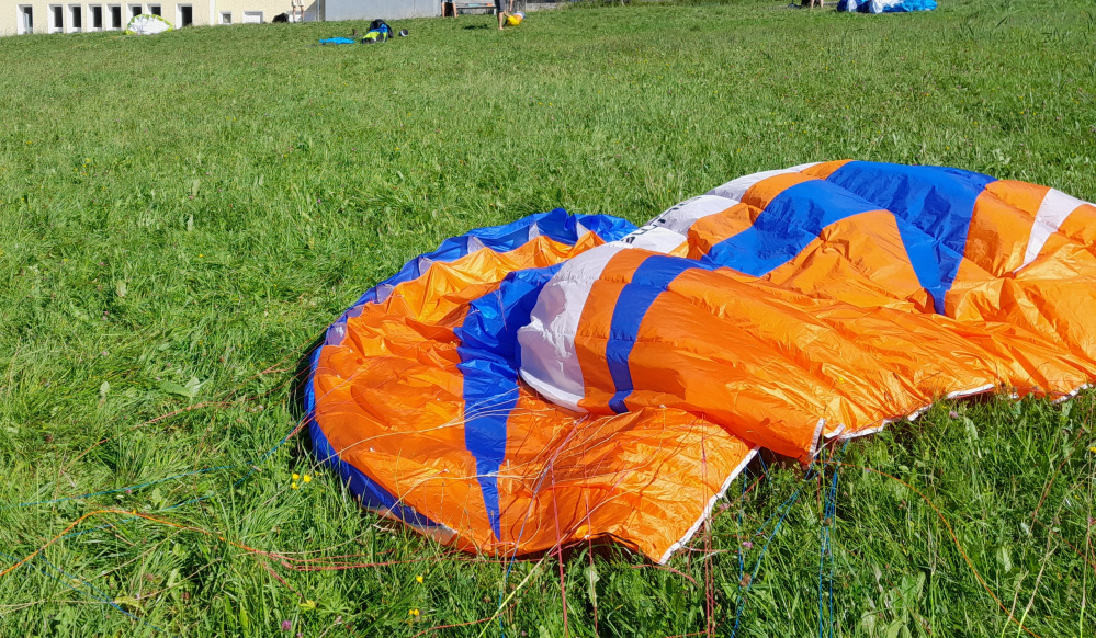 Gebrauchter Mito von Swing in XS und der Farbe Tangerine (Orange mit Weiß und Blau). 55-80kg Startgewicht. Mit RAST. Gutmütiger Schulungs-/Einsteigerschirm mit Gebrauchsspuren, aber insgesamt in Ordnung.
