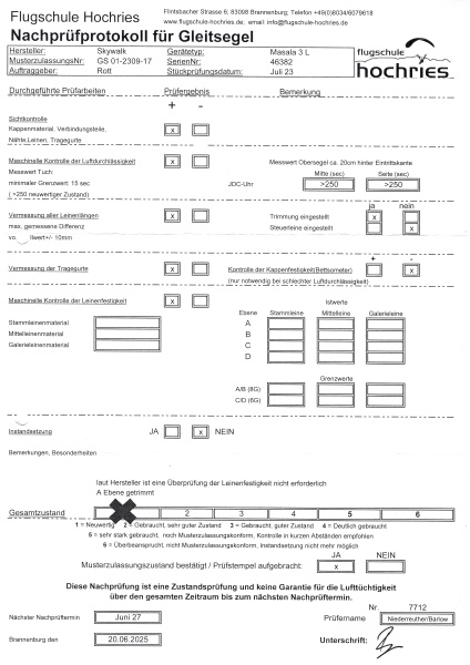 Größe: L (95-120 kg) - Baujahr: Juli 2023 - Flugzeit: 29:50 h - Check bis 06/2027 - Zustand: sehr gut / neuwertig