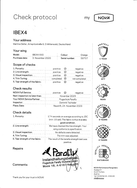 Ich verkaufe hier meinen kaum genutzten Nova IBEX4 XXS (55 - 90kg) in Orange wegen Aufgabe des Hobbys aufgrund Zeitmangels. Der Schirm ist frisch gecheckt (02.09.2025) und bekam hier den Vermerk "Gebraucht, sehr guter Zustand". Siehe Check Protokoll, beste Tuchwerte.Telefon: 01703827536