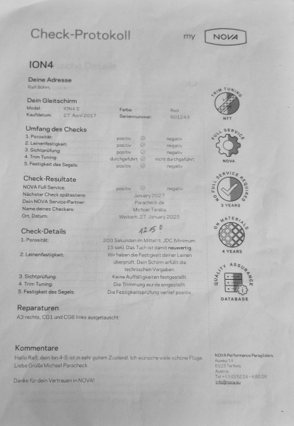 Der Gleitschirm befindet sich - auch laut Check - in einem "sehr guten Zustand".Telefon: 01792002119