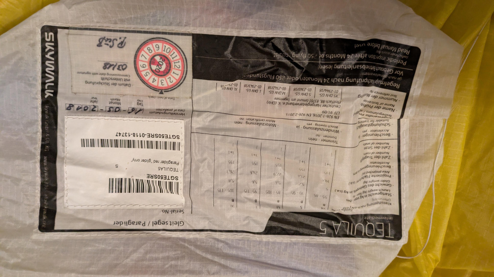 Rated "good condition" in the last check, valid until July 2026. Packed in a concertina fashion. Mostly flown from grassy launches. 150 Hours