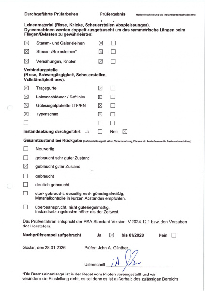 Baujahr 2021, ausschließlich privat geflogen. Der Schirm hat seinen 2 Jahres-Check im Januar 2026 bekommen und befindet sich im Zustand „gut gebraucht“. Prüfprotokolle liegen vor und werden mitgeliefert. Der Schirm wurde stets trocken und sachgerecht gelagert, keine Wasser- oder Baumlandungen. Seit dem Check auch nicht mehr geflogen.