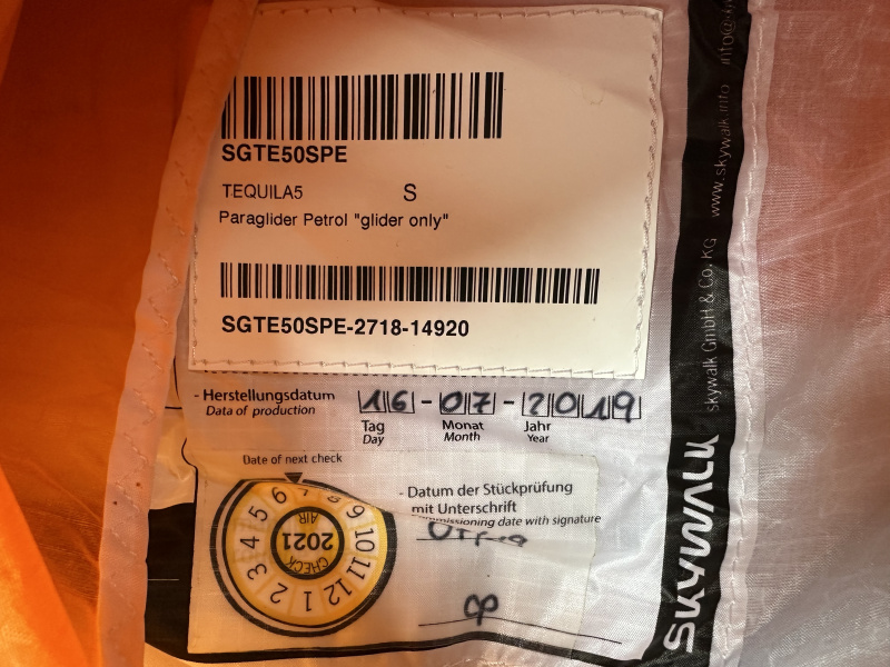 Tequila5 S wurde im Feb.2026 neu gecheckt, Tuchwerte 600sek. JDC, Allgemeinzustand „Wenig gebraucht, voll flugtauglich“.