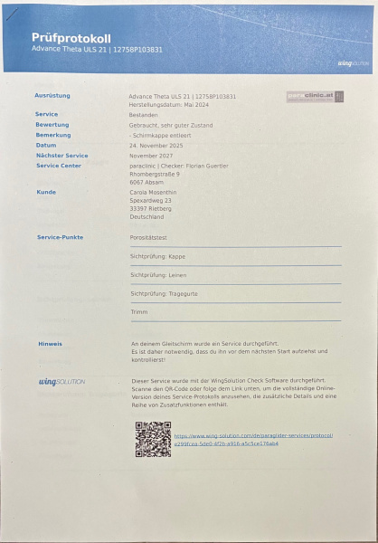 Advance Theta ULS 21, Erstflug 06/2024. Sehr guter Zustand (Prüfprotokoll vom 24.11.25), 90 Flüge, kein SIV, kein Sand.Telefon: 015114972268