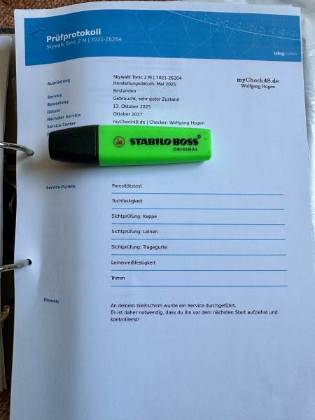 Idealer Hike & Fly Schirm, sehr wenig geflogen, Zustand laut Check (Okt 2025 danach nicht mehr geflogen) „gebraucht, sehr guter Zustand“. Checkprotokoll sende ich als PDF auf Wunsch.Telefon: 017620586053
