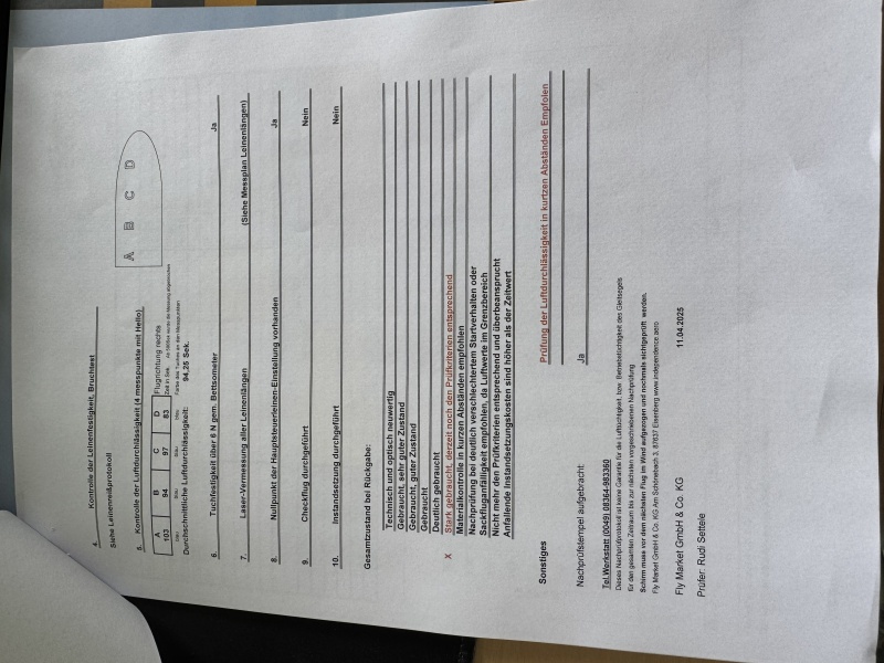 Beim check wurde eine Stelle am Obersegel geklebt. Welches nur einen Optischen Einfluss hat.
