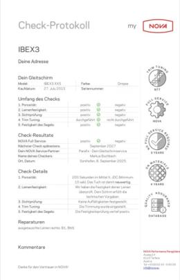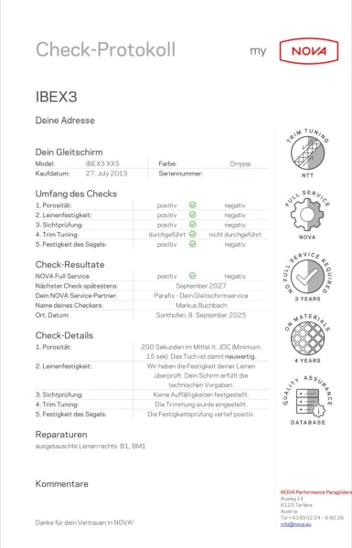 Der Gleitschirm hatte 09/25 einen NOVA Full Service (durchgeführt am 08.09.2025 bei Parafix) und hat ein hervorragendes Zeugnis erhalten:
