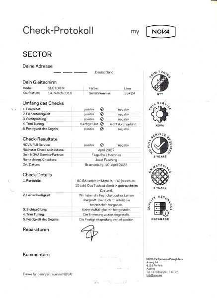 Verkaufe wg. Umstieg einen Nova Sector M (90 - 110 kg) in gutem Zustand, Check bis 04/27 wg. Umstieg. Idealer Einsteigerschirm in die C-Klasse, mit Streckung von 5,95 noch gut zu handeln. Keine Risse, Flecke, ö.ä, kein Sicherheitstraining, keine Düne. Gut gepflegt, Zustand dem Alter entsprechend.Telefon: +491717674758