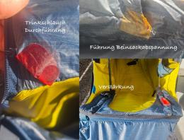 Ich selbst habe noch 3 kleine Nahtstellen (Trinkschlauchdurchlass, Beinsack Abspannung, Naht im Rückenfach) mit Tape nachgeklebt, da sich dort kleine Nähte etwas gelöst haben, sowie eine Stelle im oberen, seitlichen Rückenbereich mit Tape verstärkt (Fotos). Sind keine tragenden Teile, könnten auch schnell genäht werden.