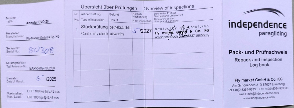 Bitte denkt daran! Luftsportgeräte müssen beim Betrieb in Deutschland mustergeprüft und stückgeprüft sei. Die Stückprüfung muss durch eine Kennzeichnung auf dem Gerät ersichtlich sein. Genaue Angaben zu dieser Kennzeichnung findet Ihr hier. |