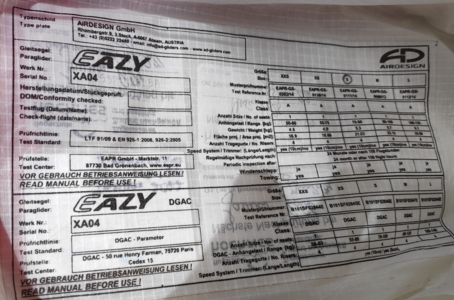 Ich verkaufe meinen Air Design Eazy Größe S. Zugelasen für 70 bis 90kg. Er ist schon etwas älter, aber er hat einen neuen Check vom März diesen Jahres - danach bin ich nicht mehr damit geflogen. Er ist mein erster Schirm gewesen und ich war immer sehr zufrieden damit. Der Eazy ist ein rundum gutmütiger, anfängertauglicher A-Schirm.Telefon: 015156907409