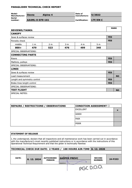 Der Schirm ist in exzellentem Zustand laut aktuellem Check und hat noch Check-Gültigkeit bis Dezember 2026 – aktuell also absolut sorgenfrei zu fliegen.