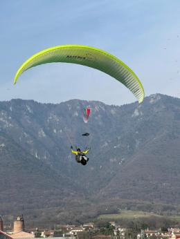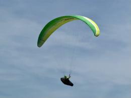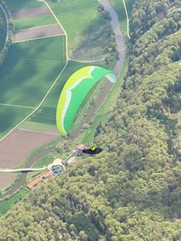 Der Schirm hat Sonderfarben und mein Firmenlogo im Untersegel. Es sind 213 h im Tuch und er ist seit 2 Wochen ganz neu getrimmt.