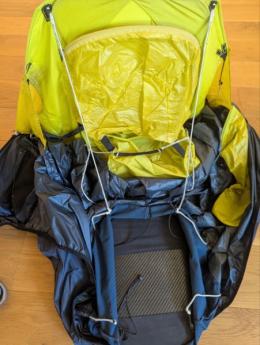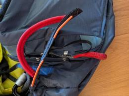 Einer der Nitinol-Stäbe war gebrochen. Es wurden beide ersetzt und zudem an der Heckflosse und vorne am Staudruckfach Patches an Wetzstellen angebracht. Bei dem Verschlusssystem des Beinsacks war die Ummantelung der Dyneema-Leine abgerieben, beide (links und rechts) wurden von Skywalk getauscht.