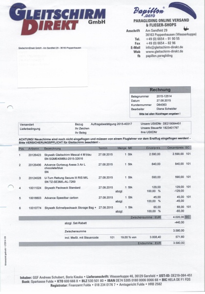 Ich verkaufe meinen Gleitschirm Mescal 4, den ich als neuen Gleitschirm auf der Wasserkuppe bei Papillon (siehe Kaufbeleg) im August 2015 gekauft habe.Telefon: 017642138542